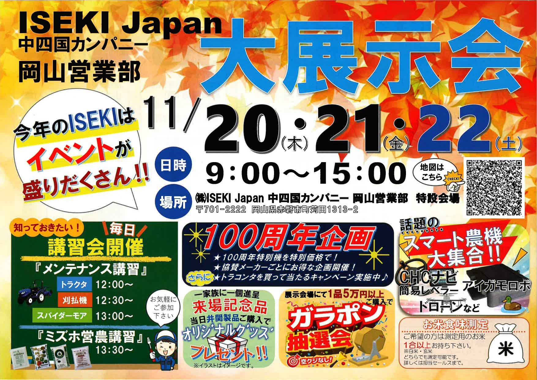 2023.10.21 新着情報 2023.11月9日(木)・10日(金)・11日(土)9:00~15:00まで(株)ヰセキ中四国主催で、赤磐市の岡山営業部にて「農家とヰセキの秋祭り」と題しまして、展示会が開催されます。興味がございましたら、来場ください。担当セールス不在の場合がございますので、来場予定がございましたら、弊社担当セールスマンにお声掛けください。 メインチラシ ←メインチラシの文字をクリックいただくとチラシが確認できます。 →終了致しました。