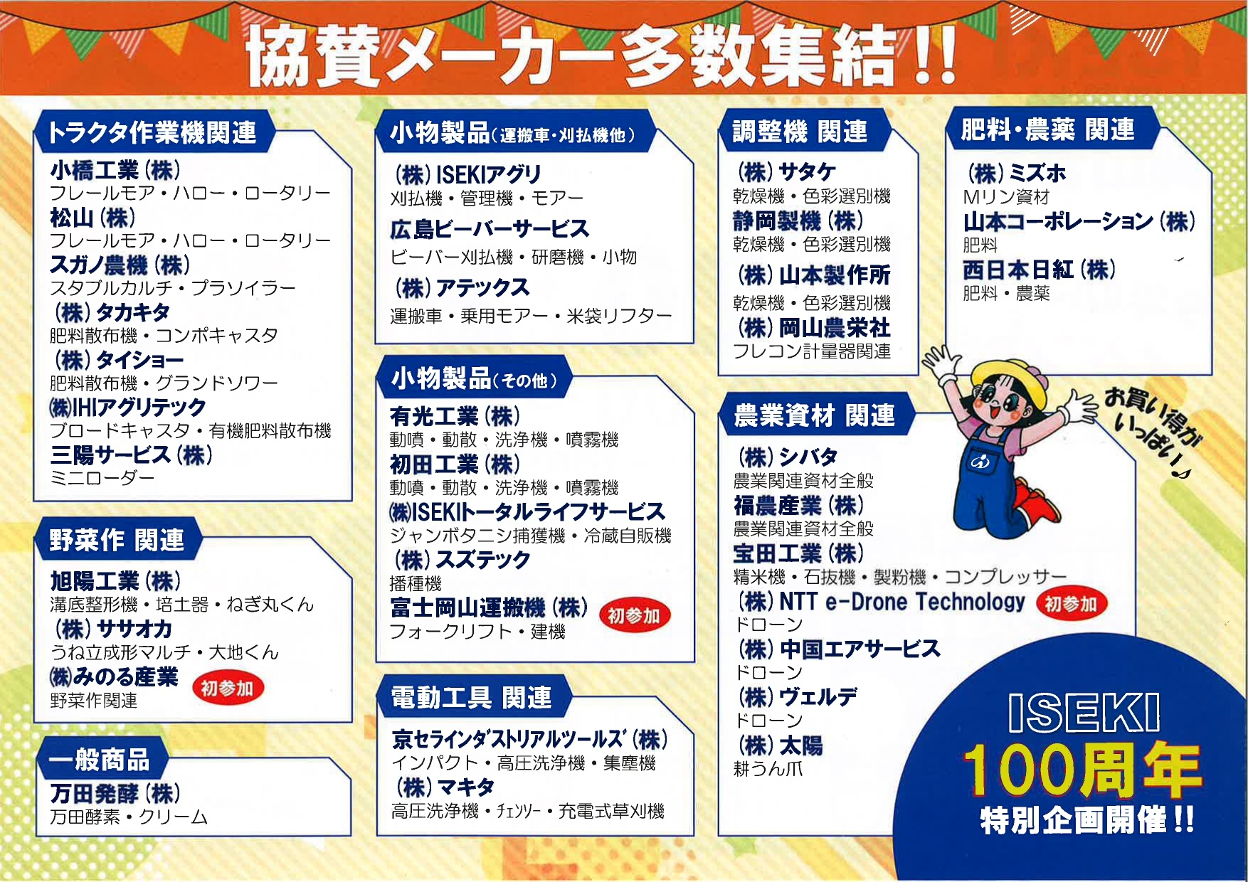 2023.3.2 新着情報 2023年3月9日(木)~11日(土)9:00~15:00 (株)ヰセキ中四国主催 赤磐市の(株)ヰセキ中四国 岡山営業部にて「スプリング フェア」と題しまして展示会を開催される予定です。 案内チラシを添付させていただきますので興味がございましたら、是非ご参加ください。 来場予定がございましたら当社 担当セールスマンに応援の都合もございますので、予定を連絡するようにしてください。 チラシ 緑の文字をクリックいただきますと、チラシが確認できます。 →終了致しました。