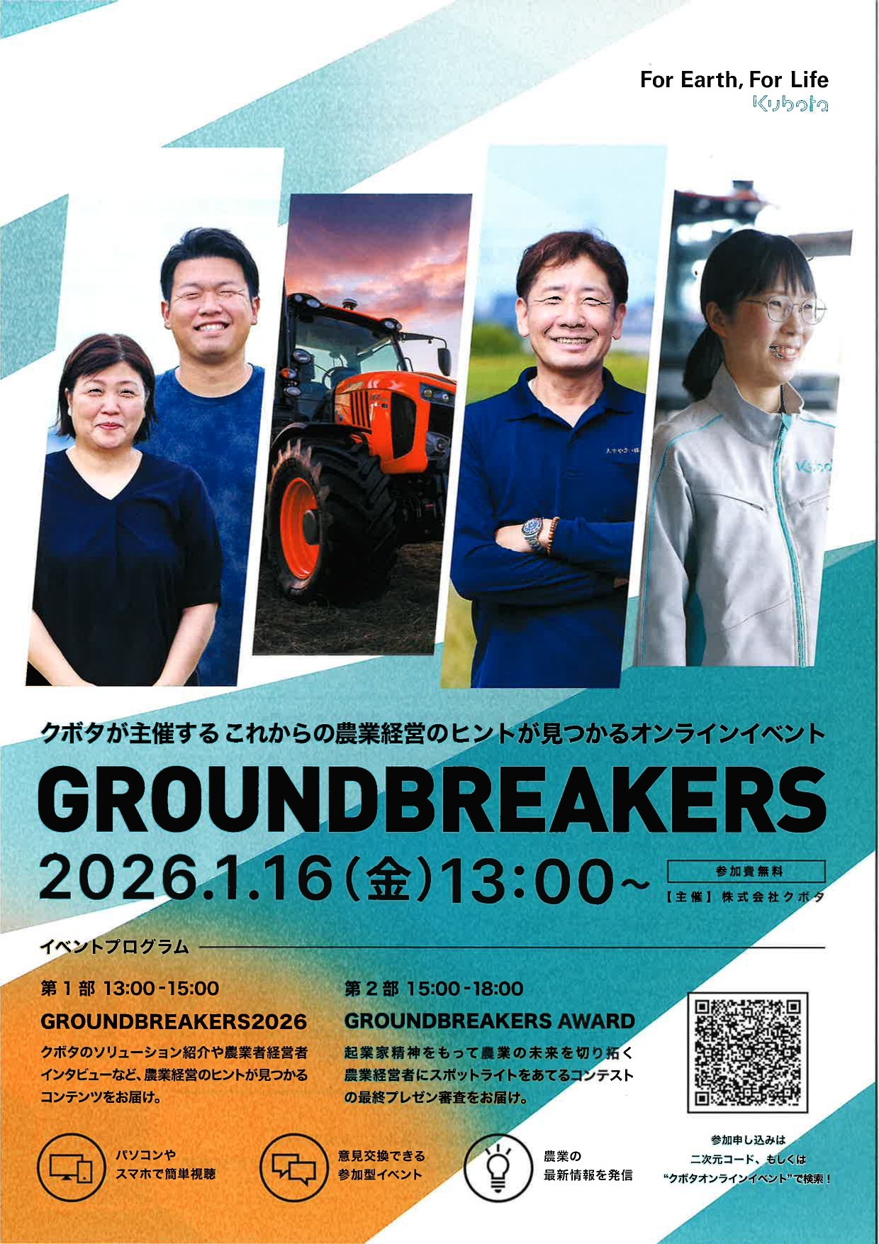 2025.12.3 新着情報 クボタ 新春オンラインイベント「GROUNDBREAKERS」が2026年1月16日(金)13:00~開催されます。興味のあるお客様は是非、参加・視聴ください。尚、視聴いただくには事前登録が必要になります。チラシのQRコードもしくは”クボタオンラインイベント”で検索いただき、参加登録をお願い致します。 チラシ チラシ(タイムスケジュール) 緑の文字をクリックいただくとチラシが確認できます。