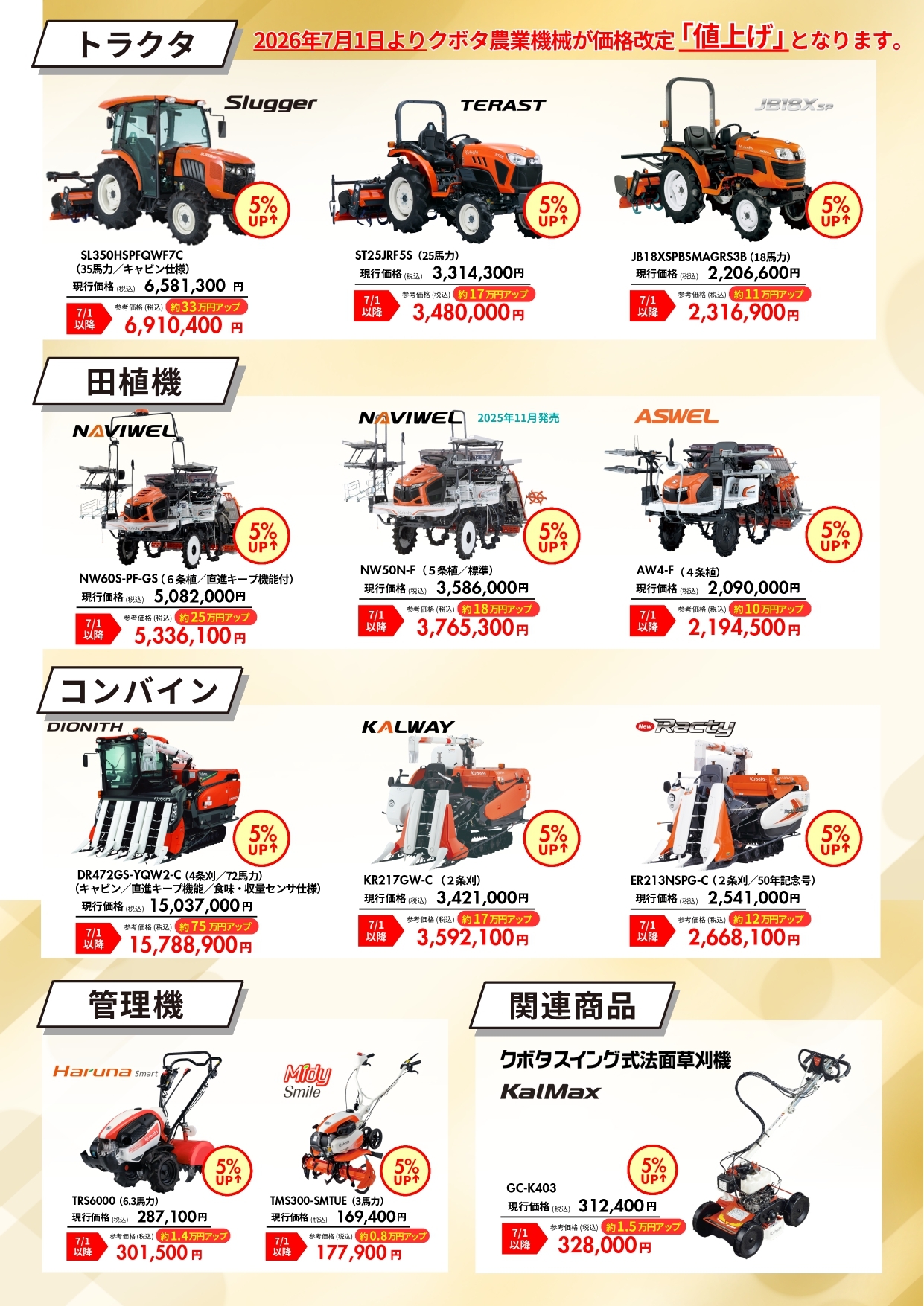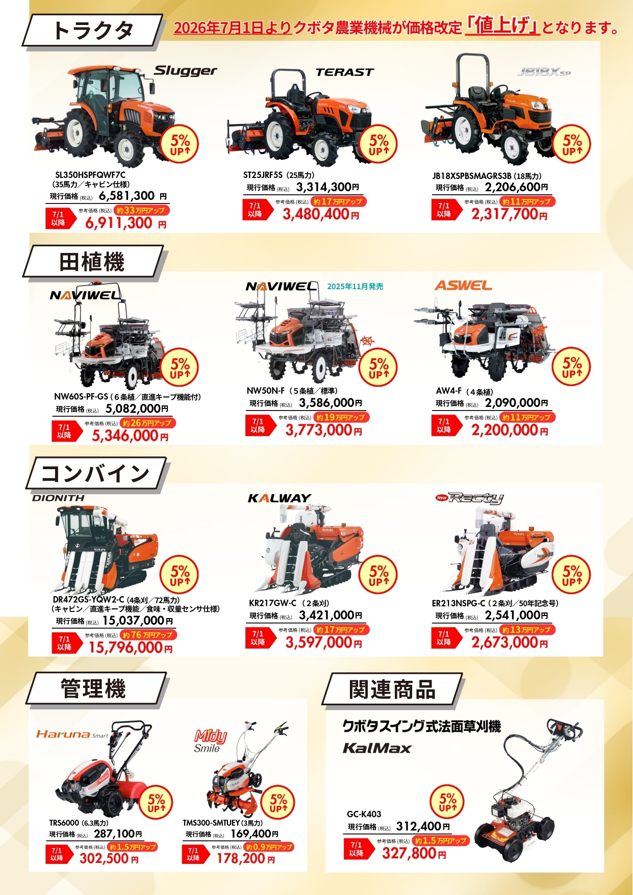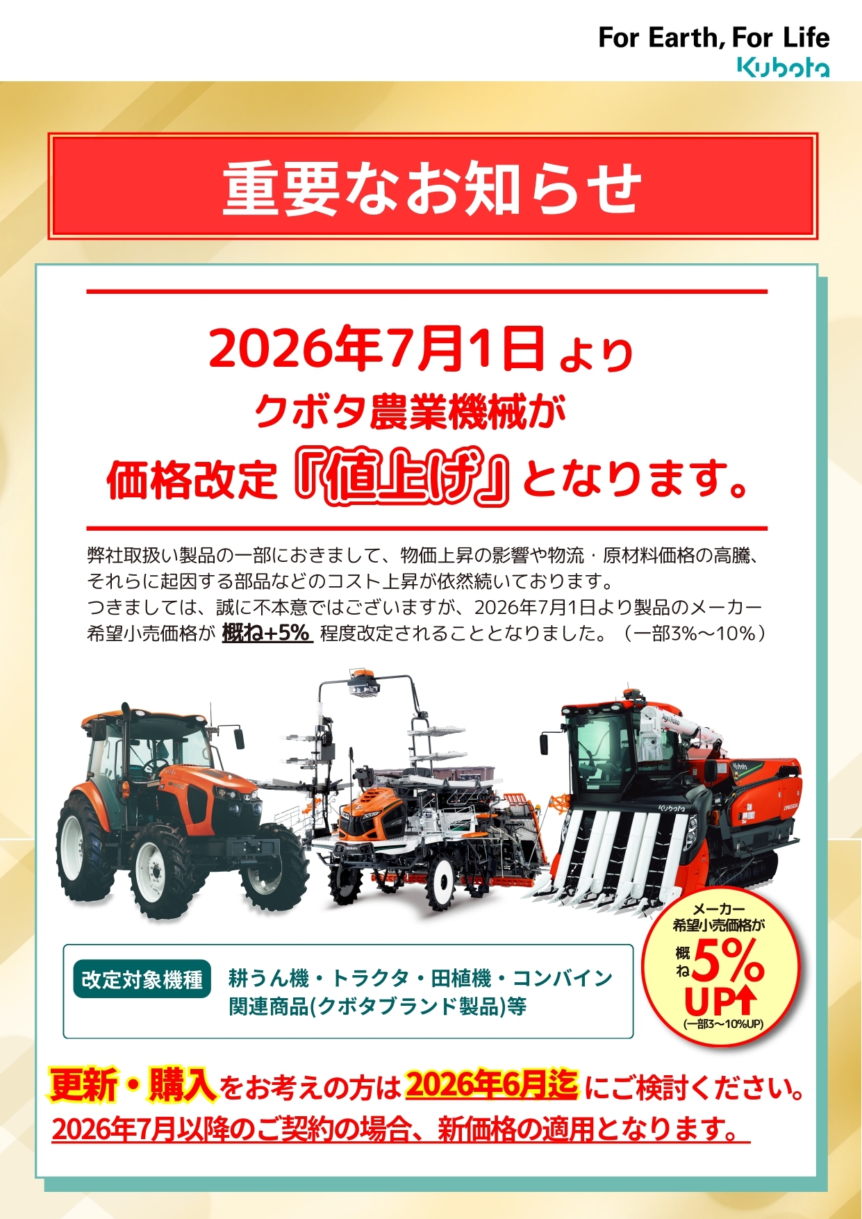 2026.4.8 重要なお知らせ クボタ農業機械製品の一部が7月1日より、物価上昇の影響や物流、原材料価格の高騰、それらに起因する部品などのコスト上昇が依然続いており、価格価格改定「値上げ」の案内が届きました。概ね+5%程度、一部商品は10%の大きな改定となります。更新・購入をご検討のお客様がおられましたら、お早めにご検討ください。